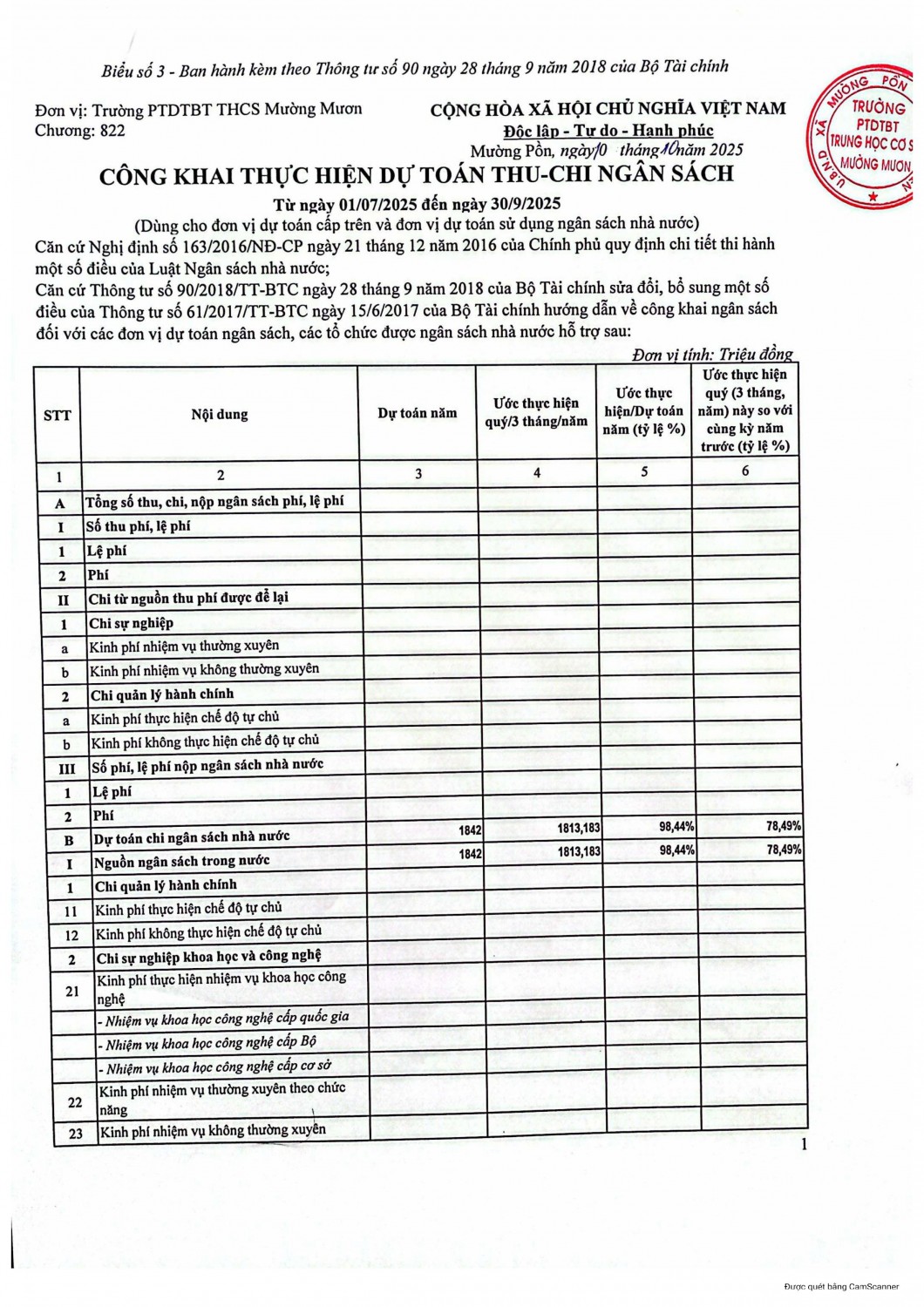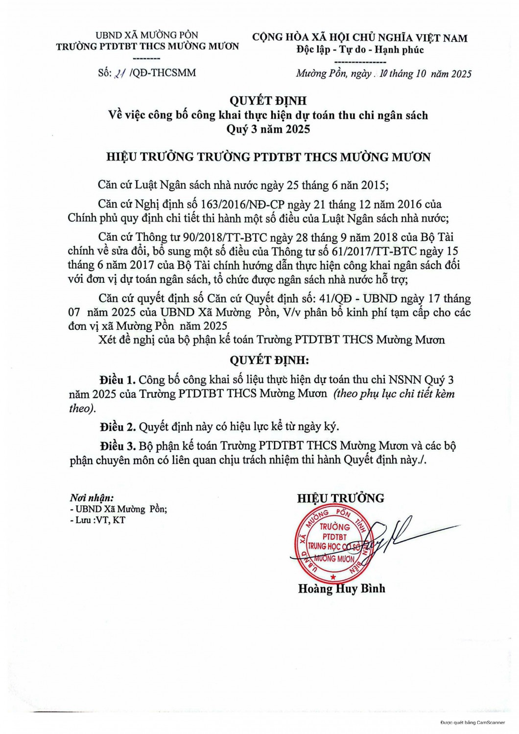 QUYẾT ĐỊNH Số: 2/ /QĐ-THCSMM-Về việc công bố công khai thực hiện dự toán thu chi ngân sách Quý 3 năm 2025